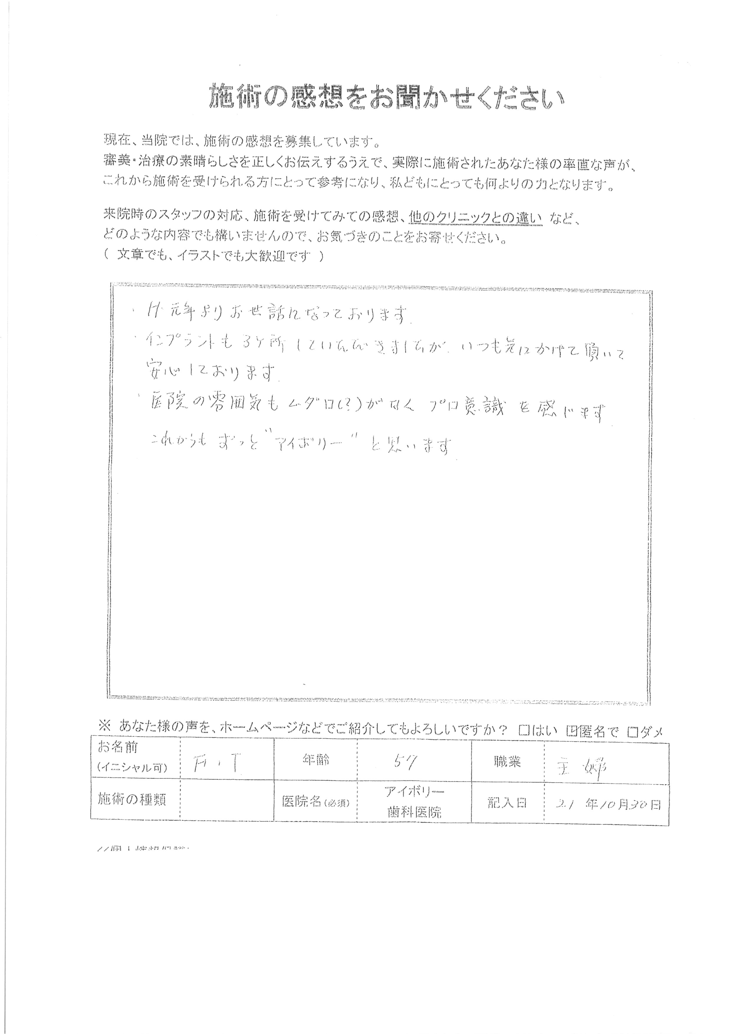 ・インプラントも3ケ所していただきましたが、いつも気にかけて頂いて安心しております