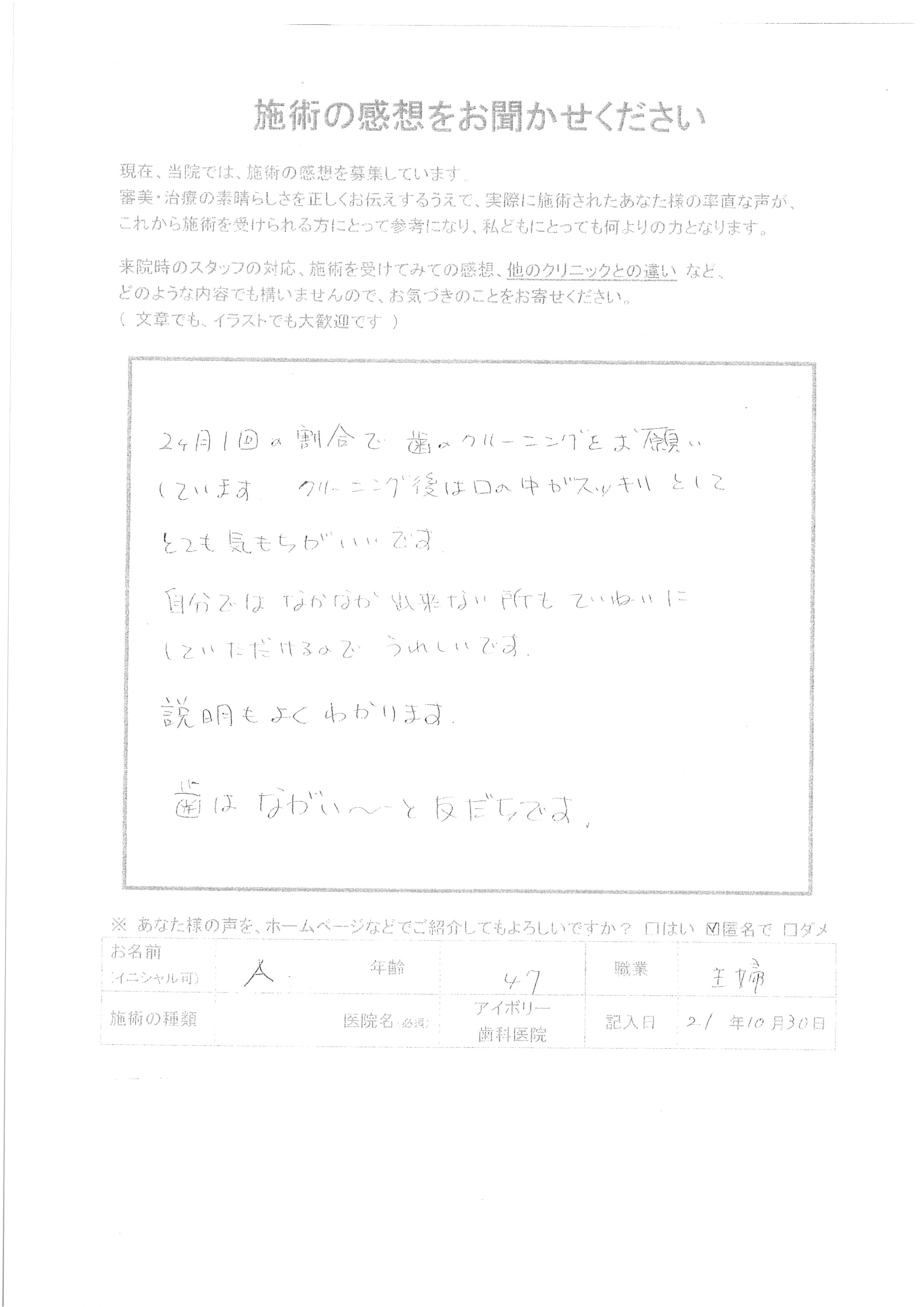 クリーニング|T.K様 |60代|西千葉・千葉市のアイボリー歯科医院|患者さんの声